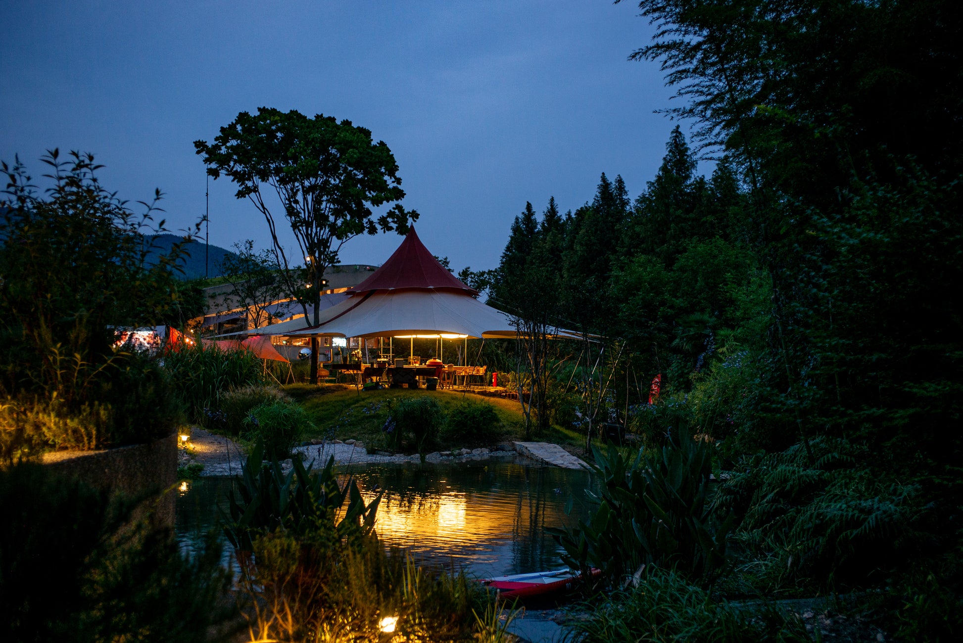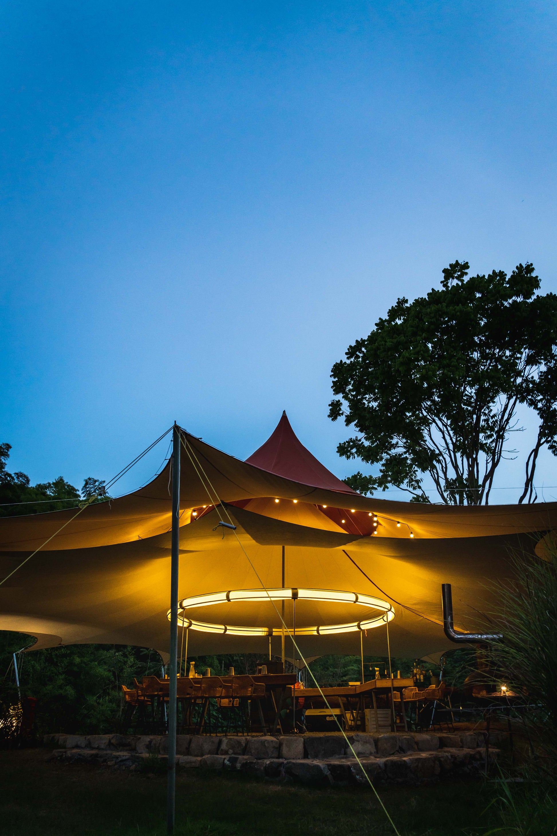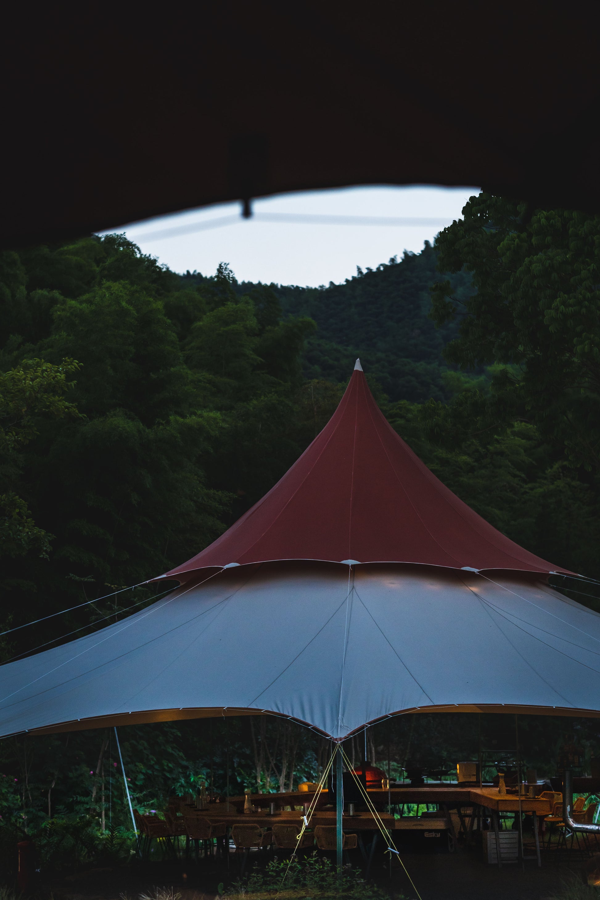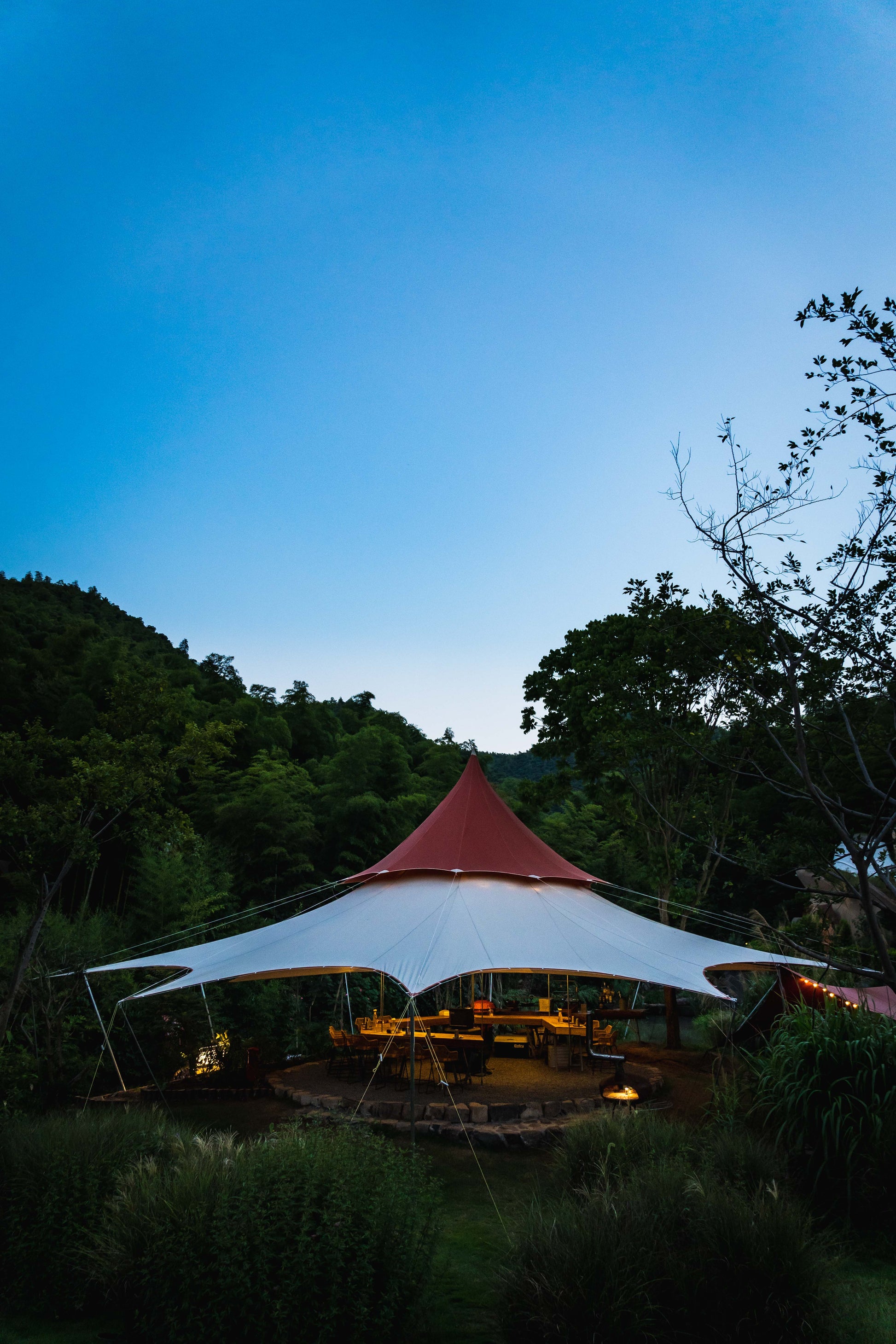 The Volcano tent boasts a desert-colored body and a red canopy, providing excellent 360-degree views. Ideal for large events, it never blocks photographers and its tall stature makes it a visual focal point. The traditional double-layer canopy not only adds an elegant shape but also allows hot air to escape quickly in summer, keeping the interior cooler.